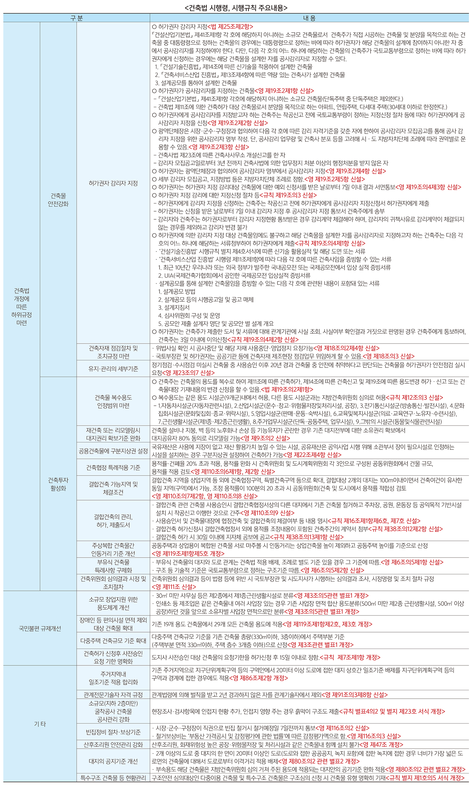 건축법 개정에 따른 하위규정으로는 허가권자 감리자 지정 소규모건축물 범위, 건축물 복수용도 인정범위, 결합건축 절차 및 관리기준 등이 해당된다. 다음은 입법예고 내용.