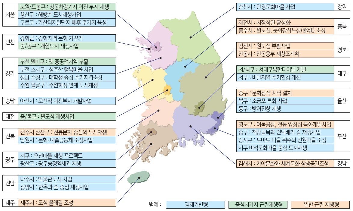 공공청사 이전부지, 유휴항만 등을 거점으로 해 도시경제 활성화를 도모하는 경제기반형 사업은 서울 노원·도봉구, 대구 서·북구 등 5곳이고 개소 당 6년간 최대 250억원이 지원된다. 특히 서울 노원·도봉구는 철도차량기지가 이전되는 부지에 K-POP 공연장 및 특화산단을 유치하고 서울 동북권 신경제중심지를 조성한다는 계획이다. 현재 마중물사업으로 국내 최초 컨테이너형 문화공간인 ‘플랫폼창동61’이 건립돼 도시재생 붐업역할을 하고 있다.