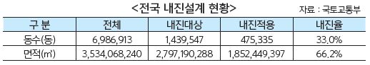 현재 전국 내진설계 현황을 보면 2015년 12월 현재 내진설계가 적용된 비율이 동수기준으로 전체 699만동 중 33%에 불과하고, 면적으로는 35억㎡ 중 66.2%에 그친다는 국토부의 결과가 나와 있다. 국내 건축물 절반 이상이 지진에 취약한 셈이다. 특히 국내 지진설계는 규모 5.5∼6.0을 기준으로 멕시코의 내진설계 기준 사례를 가져와 고층건축물을 대상으로 내진설계가 규정돼 있는 관계로 국내 전체 건축물의 80∼90%가 소규모 건축물임을 감안할 때 내진설계 확대는 필요하다고 볼 수 있다.