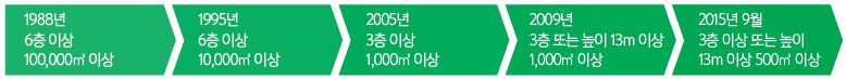 ◆ ’88년 6층 이상, 100,000㎡ 이상→’15년 3층 이상 또는 500㎡ 이상 내진설계 대상 확대