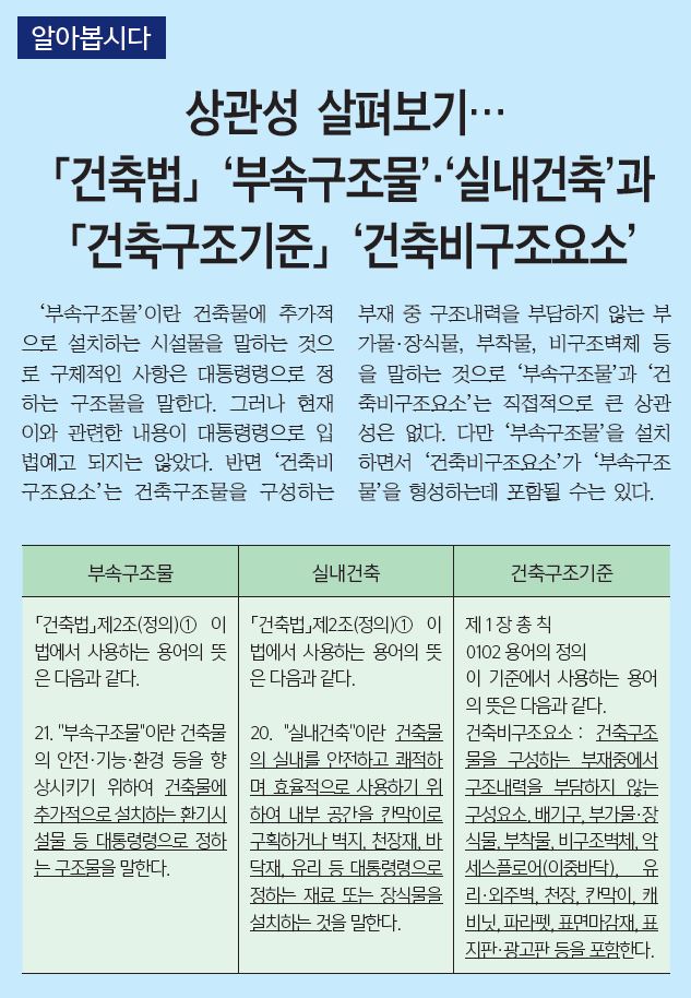 그러나 개정고시문을 살펴보면, 용어의 정의 중 ‘기본설계’가 ‘중간설계’로 바뀐 것 이외에는 사협의 의견이 거의 반영되지 않았다. 국토부 관계자에 따르면 “구조기술사회·건축학회 검토의견이 개정고시에 주로 반영된 결과로 특히 ‘비구조요소’란 용어를 ‘부속재료’로 바꾸는 사안은 현장에서 오랜 기간 사용한 용어를 갑작스레 바꿀 수 없는 점이 고려가 됐다”라고 설명했다. 아울러 건축구조기준이 당장 시행되는 점도 업계 건축사들은 크게 반발하고 있다. 기준 개정 필요성은 인정하지만, 현장에서 준비할 시간이 필요해서다. 한 업계 건축사는 “고시된 내용을 보면, 종전에 없던 게 생기고, 강화된 내용들이 당장 시행·적용돼야 하는데 건축허가 과정에 있는 것도 있어 6개월 정도 유예기간이 필요하다”고 전했다. 사전홍보가 제대로 안 됐다는 설명이다. 또 건축구조기준 목적을 보면 건축법, 주택법에서 정하는 틀 안에서 구조기준 내용이 규정돼야 함에도 그렇지 못한 점도 지적된다. 건축구조기준 중 ‘공작물’의 경우 사실 건축법 범위를 벗어난 훨씬 포괄적 개념을 다루고 있어서다. 또 다른 업계 건축사는 “건축구조기준이 건축법 하위규정임에도 건축법 범위를 벗어난다면 다른 기준을 신설함이 타당하지 구조기준 내에 신호등·송전탑·광고판과 같은 공작물 내용이 있는 것은 옳지 않다”며 “건축법 하위기준이