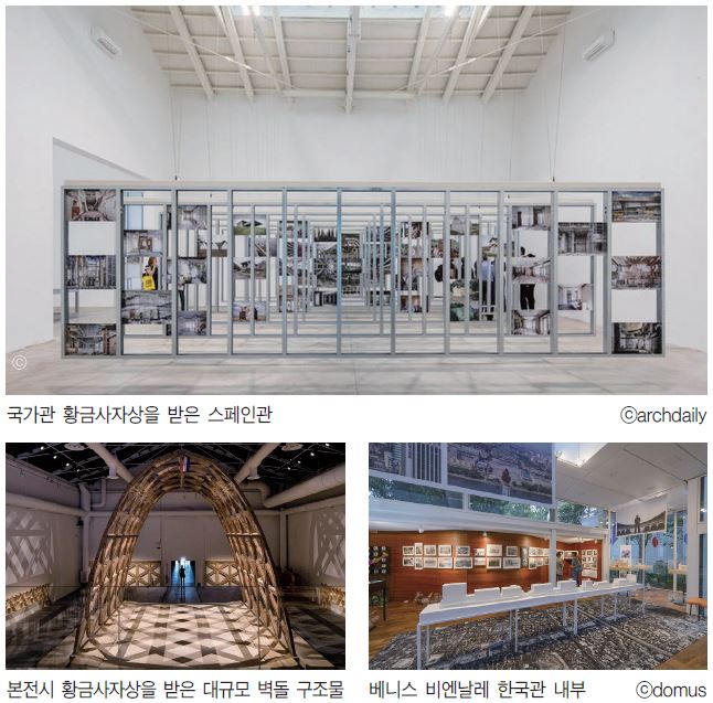 본전시에서는 파라과이 건축사그룹 ‘가비네테 데 아르키텍투라’가 황금사자상을 받았다. 붉은 벽돌을 활용한 다양한 형태의 대규모 벽돌 구조물에 베니스비엔날레 조직위원회는 “빈곤한 국가에서 쉽게 활용될 수 있는, 쉽고 효율적인 건축구조 기술을 제안했다”고 평했다.