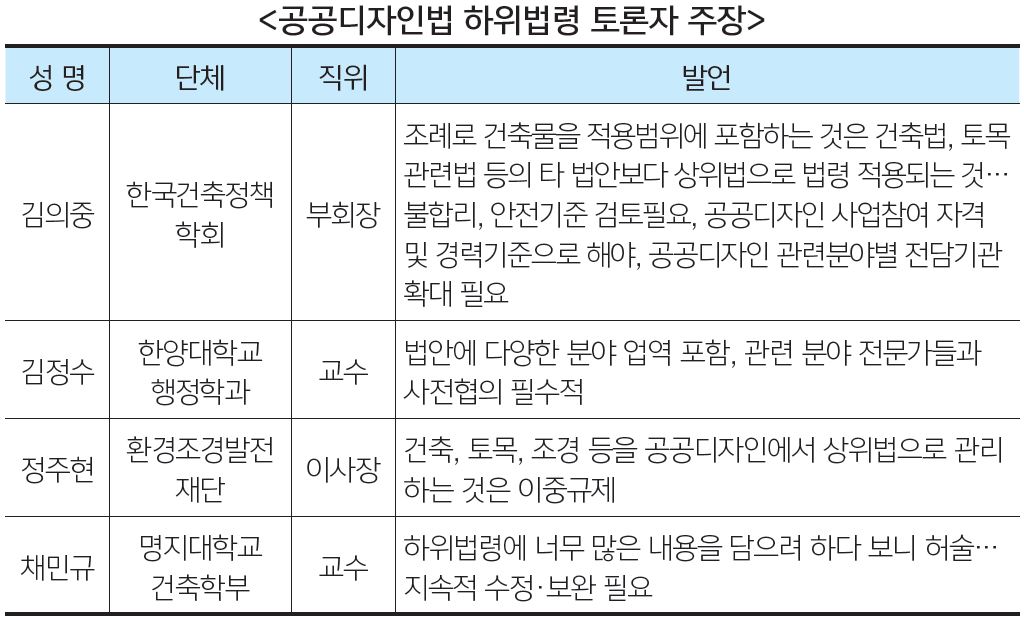 “현재 조경은 국토교통부의 건축법과 조경기준, 산자부의 환경디자인과도 연계돼 규정되고 있는데 공공디자인법의 조례안을 통해 적용범위를 확대하는 것은 타 분야와 협의·조정이 필수적이다. 공공디자인전문회사 신고기준을 마련하는 것도 업계 번거로움만 키운다.” (환경조경발전재단 정주현 이사장)