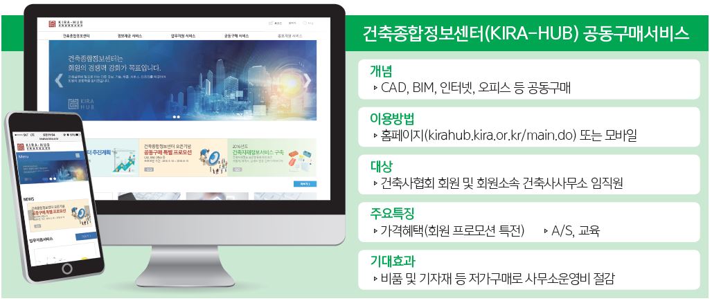정보센터는 회원 건축사사무소에 유용한 기자재 및 물품을 시중보다 저렴한 가격으로 제공하는 공동구매서비스와 함께 궁극적인 목적인 ‘회원경쟁력 강화’를 위해 차츰 ICT기반의 모바일 감리지원, 대국민 홍보지원 서비스, 건축자재 정보제공 서비스라는 ‘스마트 KIRA’의 큰 그림을 그려나가게 된다. 단, 사업성공으로 더 큰 혜택이 회원에게 돌아가기 위해선 전회원의 참여가 필수조건이다.