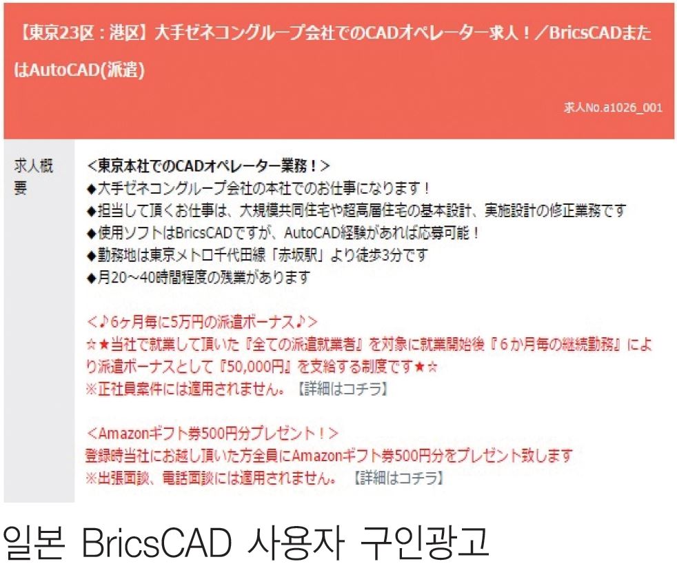 일본 CAD 사용자 구인광고에서는 대기업 건설사 파견에 있어 BricsCAD 사용자를 주로 찾고 있다. 실제 국내 공공기관·대기업 등에서 BricsCAD를 활용 해 예산절감효과를 보고 있는 것으로 알려져 있다.