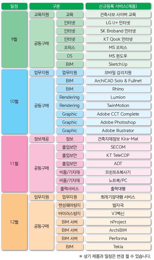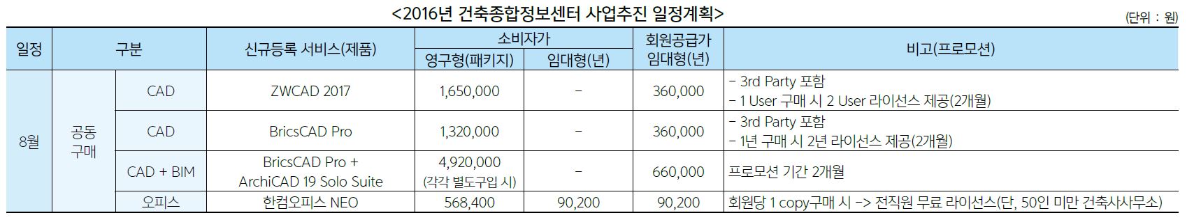 CAD는 ‘ZWCAD 2017’·‘BricsCAD Pro’를, BIM은 9월부터 ‘SketchUp’·‘ArchiCAD 19 Solo & Fullnet’이 구매품목에 포함된다. 특히 CAD, BIM이 하나로 결합된 상품도 선보인다. 8월 서비스되는 ‘BricsCAD Pro+ArchiCAD 19 Solo Suite’상품이다. 제작사가 서로 다른 SW를 하나로 묶어 판매할 수 있는 것은 1만 회원을 거느린 협회기 때문에 가능한 상품구성이다. 기존 HW와 SW결합상품은 있었지만, 제작사가 서로 다른 SW와의 결합은 세계최초다. CAD·BIM 결합 Suite제품은 프로모션으로 처음 2개월간만 진행되고, 가격도 50% 이상 대폭 할인된다. 이 외에 향후 인터넷 전용선, 오피스, Adobe Photoshop·Illustrator 등 서비스품목을 확대하고 교육 및 업무지원까지 병행하게 된다.