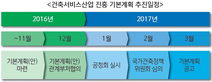 공청회에서 관계자들의 의견 수렴 및 보완을 거치면, 국가건축정책위원회 심의를 거쳐 2017년 3월경에는 기본계획이 공고될 예정이다. 제2분과위원으로 활동하는 대한건축사협회 김호준 이사는 “6월에 분과위원회 1차 사전회의를 마쳤고, 7월 말경에 2차 회의를 시작으로 본격적인 세부과제에 대한 논의가 시작될 예정이다”며 “전반적으로 사전회의에서 논의된 것은 건축서비스산업에 대한 범위가 광범위하기 때문에 1차적으로 건축설계에 집중해 2차적으로 관련분야로 확장하는 방법으로 계획을 수립하자는 논의가 나왔다”고 전했다. 이어 제1분과 위원인 유흥재 대한건축사협회 이사는 “현재는 전반적인 기본계획과 업무분장을 논의하는 단계지만, 본격적인 회의를 거쳐 대가기준 개선 등 업계현안에 현장의 목소리가 반영될 수 있도록 하겠다”고 말했다.