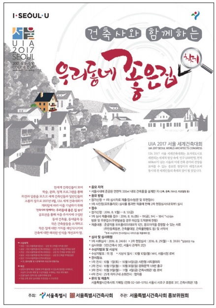 응모자격은 서울시내에 준공된 연면적 330㎡ 내외 건축물 설계자. 참가신청서 및 기타 자세한 사항은 서울특별시건축사회 기획팀(전화 02-581-5715)으로 문의 가능.