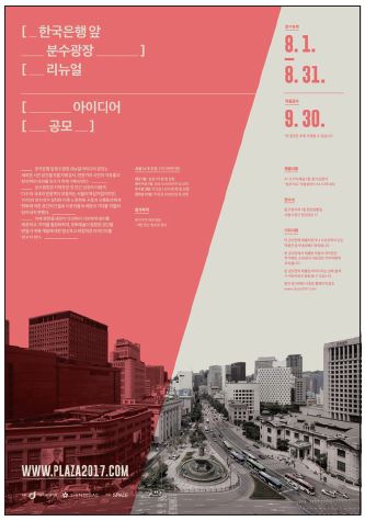 참가자격은 제한이 없으며 대상 팀은 상금 1억 원. 대상지는 서울 중구 한국은행 앞 분수광장이고, 자세한 사항은 공모전 홈페이지(www.plaza2017.com) 참고.