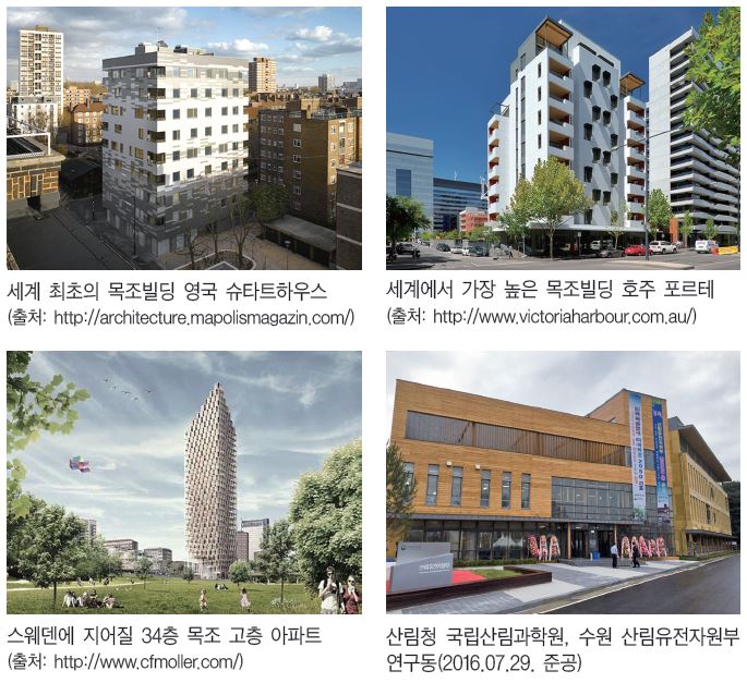 ▶세계 목조 고층빌딩 동향 : 2009년 영국 런던(슈타트하우스-세계최초)은 9층(29m) 높이의 29세대가 거주할 수 있는 아파트가 건립된 바 있으며, 2013년 호주 멜버른(포르테-세계최고층)에는 10층(32.17m) 높이의 아파트가 건립됐다.