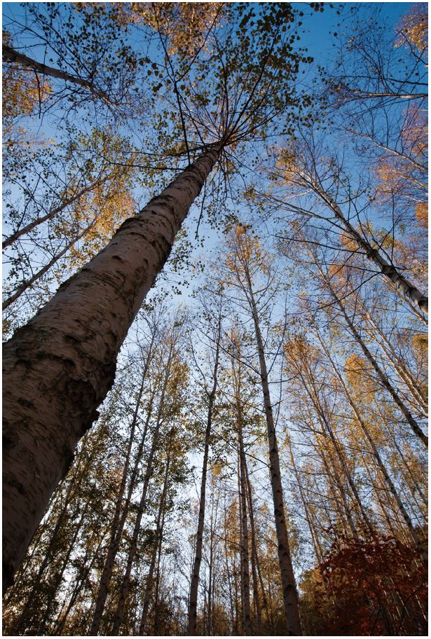 파란 가을 하늘을 향해 곧게 뻗어있는 순백의 자작나무들.