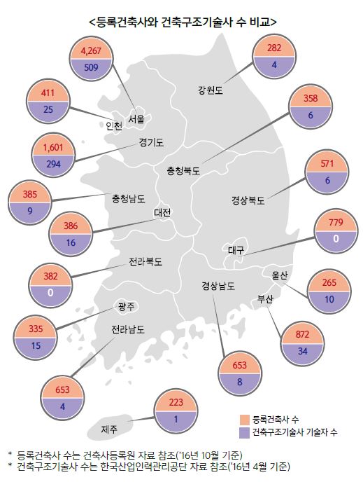 대한건축사협회 정책연구실은 “현재 구조사무소는 396곳으로 수도권을 중심으로 편중된 기형적 구조인데, 대구·전북처럼 구조기술사가 아예 없는 지자체도 있다. 그 외 제주는 지난 몇 년 간 신축활동이 제일 활발했던 곳인데 1명뿐이다”며 “구조기술사가 전혀 없는 지자체의 경우 현장검증 문제와 더불어 현행 6층 이상 건축물의 경우 구조기술사의 구조안전확인 협력이 의무화돼 있어 연간 12만건 이상의 허가대상 건축물 안전을 고려해 적정 구조기술사 양성이 시급하다”고 강조했다. 덧붙여 “구조기술사 및 구조사무소가 절대적으로 부족한 상황인데 구조안전확인 협력대상을 3층 이상으로 확대한다는 건 실효성이 없다”고 전했다.