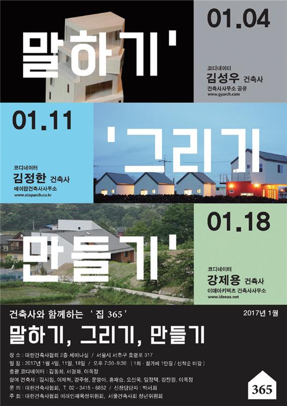2017년 1월 4일, 11일, 18일 3회에 걸쳐 ‘대한건축사협회 미래인재육성위원회’와 ‘서울건축사회 청년위원회’에서 주최하는 ‘건축사와 함께하는 집365’강좌가 열린다.
