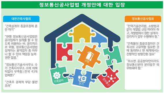 또 건축물의 품질에도 역행한다고 강조한다. 류치열 사협 정책연구실장은 “건축물 설계·감리업무는 건축사법에 따른 건축사사무소를 개설한 건축사만 할 수 있는데, 정보통신공사업법의 설계자는 용역업자 중 아무나 할 수 있어 책임질 수 있는 능력·권한이 없다”며 “건축법에 따른 건축설비의 관계전문기술자는 기술사를 의미하는데, 정보통신공사업법의 용역업자는 기능계 정보통신기술자(기사)도 할 수 있게 돼 있다”고 말했다.