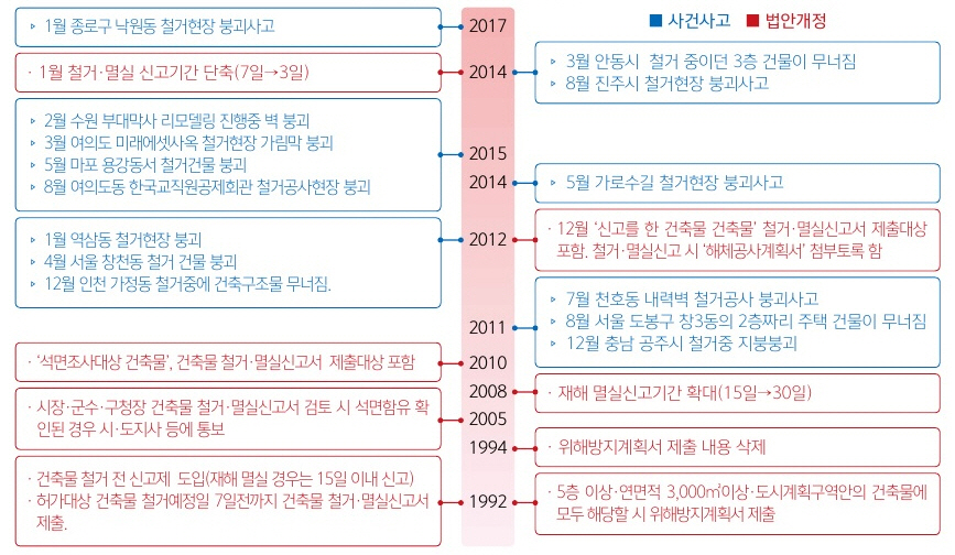 2011년 역삼동 철거현장 붕괴사고 이후, 후속조치로 소유자·관리자가 건축물을 철거하려면 철거하기 전 허가권자에게 건축물철거·멸실신고서와 ‘해체공사 계획서’를 함께 제출하도록 건축법 시행 규칙이 개정된바 있다.