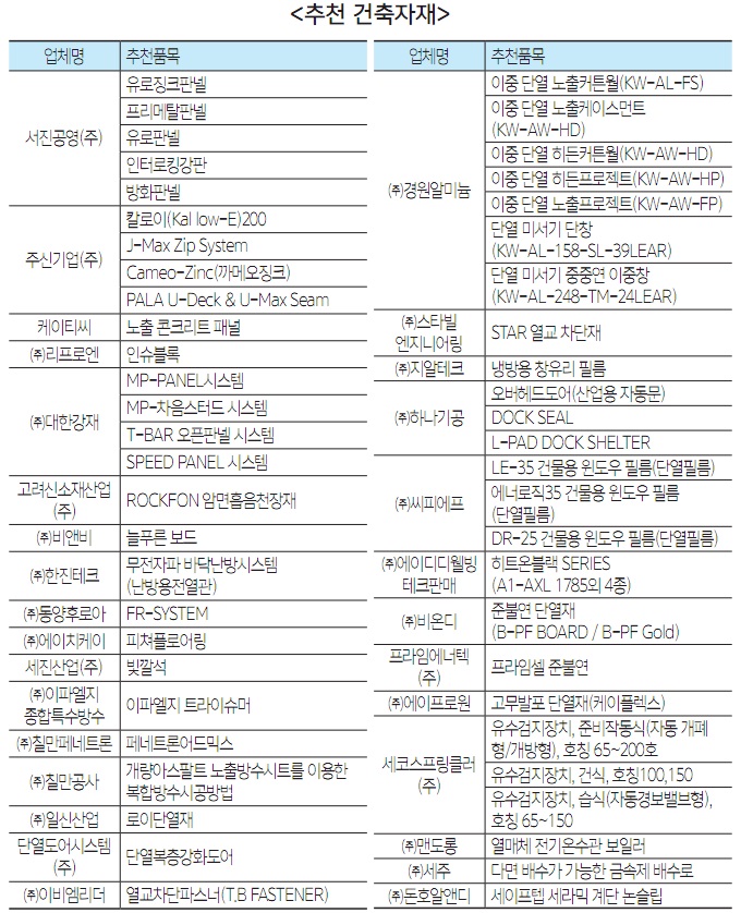 자재추천업무규정에 의거해 추천 건축재재 공람을 2월 14일부터 진행했다. 2016년도 신청품목 중 심사를 통해 총 52개 품목을 선정, 협회 홈페이지에 품목별 첨부자료 등을 공개했다. 사협은 우수한 건축자재를 선택할 수 있는 기준을 제시하고 건축사 업무 편의와 건축물의 질적향상을 도모하기 위해 ‘건축자재추천제’를 시행하고 있다. 공람 기간 동안 추천품목에 이견이 있을 시에는 전시사업팀(02-3415-6866~8)으로 문의하면 된다.