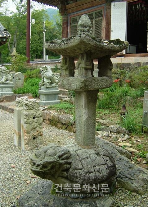 마찬가지로 이 시대의 석등은 구조적으로 약한 등받침의 볼에 살(턱)을 붙여서 두툼하게 만든다. 받침의 볼만 쳐질 수가 없으므로 지붕에도 곡을 둬서 역학적 무거움을 장식으로 감추려고 한다.