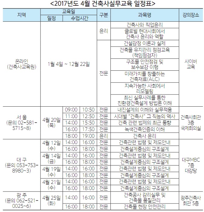 건축사교육원은 4월 건축사 실무교육 일정을 공고했다. 수강신청은 해당 과목 교육일 2~3주 전부터 가능하며, 자세한 사항은 건축사교육원 홈페이지에서 확인할 수 있다. 교육 관련 사항은 사이버교육은 건축사교육원에, 그 외 교육은 해당 시도건축사회에 문의하면 된다.