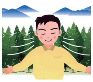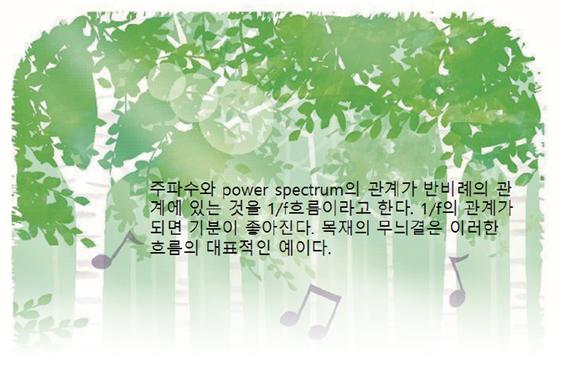 우리가 숲이 좋은 이유는 뭘까? 나뭇잎 사이로 새어 나오는 눈부신 햇살, 그 신비함에 구름도 잠시 쉬었다가는 오솔길, 그 사이로 흐르는 바람을 타고 살랑거리는 나뭇잎, 돌부리 사이를 타고 흐르는 작은 개울물의 합창, 산토끼가 남기고 간 옹달샘의 파동, 햇살에 반짝이는 이끼, 개울이 모여서 만든 작은 폭포, 산새들의 합창… 말로는 표현을 할 수 없을 정도의 아름다운 자연의 흐름이 있기 때문이다. 이러한 자연의 흐름현상을 수리적으로 해석한 것이 「1/f의 흐름」이다. 파워(스펙터클 밀도)가 ‘주파수 f’에 반비례하는 아주 작은 주기에서 벗어난 어긋남을 말한다. 물리적인 양과 질이 시시각각 변화할 때 그 양이나 질은 평균적으로 일정한 간격을 갖는 것처럼 보이지만 실제는 미세한 엇갈림이 있다. 인간은 엄마 뱃속에서부터 빛과 소리에 적응하며 태아는 「1/f의 흐름」을 심장 고동과 같은 리듬으로 각인한다. 이로 인해 안락함과 쾌감을 느끼며 치유의 리듬을 갖는다고 한다.