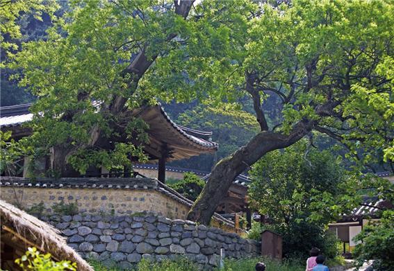 신록이 우거진 경주 양동마을 심수정에서 성년식 광경을 지켜보다가 뜰로 내려왔다. 몇 백 년의 시간을 살아온 정원의 고목은 긴 세월의 깊이를 아는 듯 묵묵히 서있다. 특히 석축 담장 너머로 휘어질 듯 멋들어지게 뻗어있는 회화나무가 돋보인다. 물아일체의 심경으로 한참을 바라보니 마음이 물처럼 맑아진다. 푸르름이 뚝뚝 떨어진다.