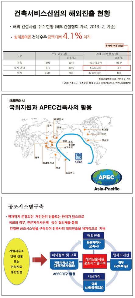 국내 건축 경기 침체로 인해 건축설계 물량이 줄고 있는 시점에서 국내 건축사의 해외시장 진출은 국내 시장의 한계를 극복할 수 있는 대안으로 제시되고 있다. 한미 FTA 등 세계 각국과의 자유무역협정 체결로 거대한 건축 시장이 생성됐다. 해외건설협회가 조사한 2013년 기준 건축서비스 산업의 해외진출 현황에 따르면, 건축서비스 산업은 전체 해외 건설사업 수주 금액의 4.1%에 불과했다. 우리나라 건축서비스산업 사업체당 매출액은 28개의 OECD국가 중 20위로 평균 매출액의 63%인 것으로 나타났다.