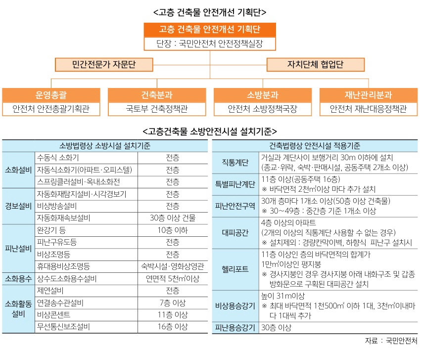런던 화재 여파로 우리나라 화재 안전점검에도 비상이 걸렸다. 정부는 화재안전 대책 마련에 나서면서 고층 건축물 화재안전 민·관 합동회의를 6월 21일 갖고 ‘고층 건축물 화재안전 종합 개선대책’을 8월말까지 마련키로 했다. 이날 ▲건축 ▲소방 ▲재난관리 등 분야별 학계, 전문가와 지자체가 참여하는 ‘고층 건축물 안전개선 기획단’(단장 국민안전처 안전정책실장, 이하 기획단)이 구성됐다.
