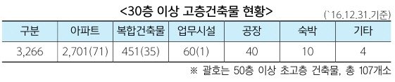 국민안전처에 따르면 전국 30층 이상 고층건물은 3,266개소로, 이중 50층 이상 초고층건물은 107개소다. 정부는 고층건축물 화재예방을 위해 안전 분야 관계부처 합동으로 건축 외장재, 소방시설, 피난·방화설비 등에 대한 안전점검을 실시할 예정이다. 건축물별 용도 및 이용자 특성에 맞는 화재 시 대피요령이나 초기 대응방법 등을 교육하고, 인테리어 공사 등 화재위험 작업 시에는 사전허가제를 운영해 건축물에 대한 화재발생 요인을 차단하겠다고 밝혔다.