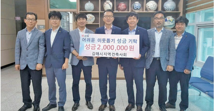 김해지역건축사회는 7월 25일 장유1동 행정복지센터를 찾아가 이웃돕기 성금 2백만원을 전달했다고 밝혔다. 김해지역건축사회 최일권 회장은 "회원들의 마음을 담아 모은 성금이 어려운 이웃들에게 조금이나마 도움이 되었으면 한다"고 전했다.