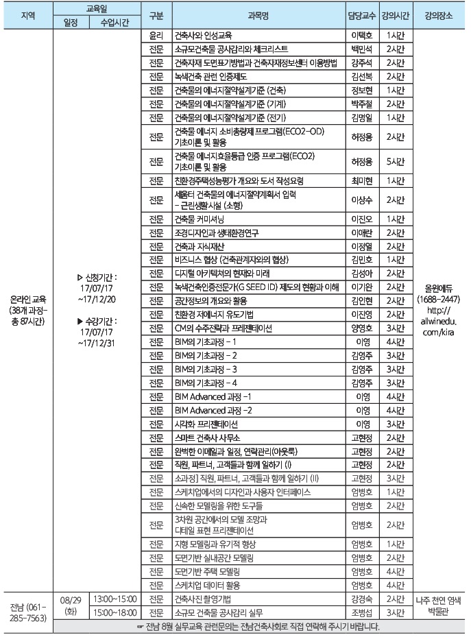 사이버교육을 포함한 8월 건축사실무교육 일정이 공고됐다. 수강신청은 해당 과목 교육일 2~3주 전부터 가능하며, 자세한 사항은 건축사교육원 홈페이지(http://www.kiraeb.or.kr)에서 확인할 수 있다. 실무교육 이수시간 인정기준은 5년간 총 40시간(윤리 5시간, 전문 25시간 이상, 자기계발 10시간 이하)이다.