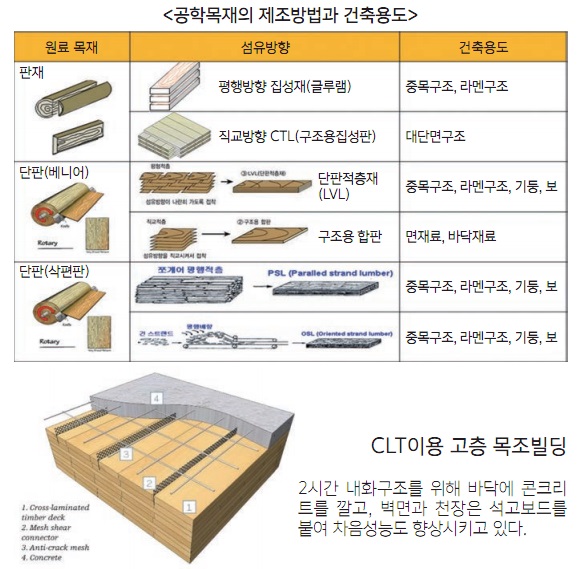 건축재로서「목재」는 단점이 더 많은 재료다. 썩고, 타고, 벌레먹고, 뒤틀어지고, 사용하기 어렵다는 등이다. 이러한 단점은 자연에서 얻는 유기재료의 위대함이 된다는 반전이 있다. 우선 「썩는다」라는 문제에 대해서는 나무는 자연에서 얻는 유기물인 만큼 균에 의해 부패된다는 필연성이 있다. 썩기 때문에 흙으로 쉽게 돌아간다. 인공적으로 만들어진 무기재료는 자연으로 쉽게 돌아가지 않으므로 자연과 환경에도 인간에게도 결코 좋을 수 없다. 목재는 목섬유 한올한올이 모여 만들어진 생물세포의 결합체다. 그러므로 동일한 것은 있을 수 없는 각각의 개성이 있는 재료다. 목재가 갖고 있는 이러한 다양함은 조형과 공예에서는 매우 중시되지만, 건축용재와 같은 공업적 용도에 목재를 사용할 때는 섬유방향이나 옹이 등의 배열에 따라 편차가 큰 단점으로 바뀔 수 있다. 특히 건축재의 평가는 평균값으로 결정되는 것이 아니라 그 안에 포함된 가장 저질 재료에 의해 평가된다. 편차가 큰 목재는 건축사들의 기피 대상이 될 수밖에 없다. 철이나 콘크리트를 건축사들이 선호하는 이유도 충분히 납득이 된다. 공학적으로 구조계산을 하는데 목재는 강도적인 근거 자료가 충실하지 않기 때문에 목재가 주거환경에 유리하다는 것을 알면서도 사용할 수 없었다. 이러한 목재의 단점을 극복한 것이 공학목재, 즉「엔지니어링 우드(Engineering wood)」다. 단판 또는 섬유 등의 형상으로 세분화된 목재를 접착제로 붙여 압착하고, 결점 요인을 제거한 후 일정한 형상이나 크기, 강도가 나올 수 있게 가공한 목재를 말한다. 최근 고층 목조빌딩의 붐을 일으키고 있는 CLT(Cross Laminated Timber, 구조용집성판)가 그 대표적인 예다. 하나의 판면 크기가 길이 30m, 폭 10m, 두께는 임의로 조절할 수 있다. 판면 자체가 하나의 벽면이나 바닥이 될 수도 있고, 기둥이나 보를 별도로 요구하지 않는 구조체이다. 세계적으로 10층 규모 이상의 CLT빌딩이 이미 17동이나 된다. 이는 콘크리트 구조물이 아니면 불가능했던 것이 목구조로도 구조계산이 가능했기 때문이다. 시공에 있어서도 물을 사용하지 않는 건식공법이므로 종전처럼 콘크리트가 양생되는 기간을 기다릴 필요도 없다. 공기를 크게 단축할 수 있고, 인건비도 크게 절감할 수 있으며 내장으로 목재벽면을 사용할 수 있다. 시공비도 콘크리트 대비 15%정도가 저렴하다는 보고도 있다. CLT와 같은 공학목재의 이용은 금후 저탄소 녹색성장의 탄소저장 건축기술로 크게 각광을 받을 것으로 기대한다.