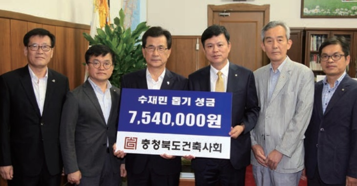 충청북도건축사회는 8월 30일 충북도청을 방문해 충북건축사회 회원들이 모금한 수재의연금 754만원을 기탁했다. 충청북도건축사회 김성진 회장은 "신속한 피해복구와 수재민들의 일상 복귀에 보탬이 되고자 협회 회원들의 뜻을 모아 성금을 전달하게 됐다"고 말했다.