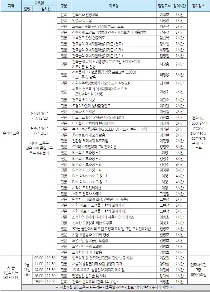 9월 건축사실무교육 일정이 공고됐다. 수강신청은 해당 과목 교육일 2~3주 전부터 가능하며, 자세한 사항은 건축사교육원 홈페이지(http://www.kiraeb.or.kr)에서 확인할 수 있다. 실무교육 이수시간 인정기준은 5년간 총 40시간(윤리 5시간, 전문 25시간 이상, 자기계발 10시간 이하)이다.