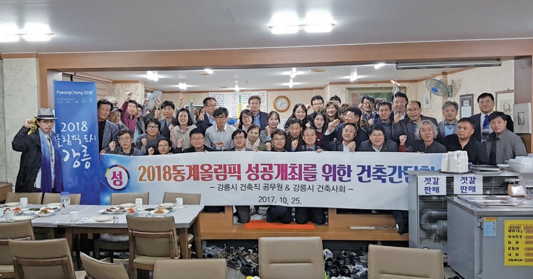2018 평창동계올림픽 성공개최를 위해 10월 25일 강릉지역건축사회와 강릉시 건축직 공무원들이 참석한 가운데 간담회가 개최됐다. 강릉지역건축사회 회원들은 경기장 인근 및 올림픽 가도 경관조성을 위해 건축공사현장 환경정비에 적극 동참하기로 하고, 건축문화 조성에 적극 협조를 약속했다.