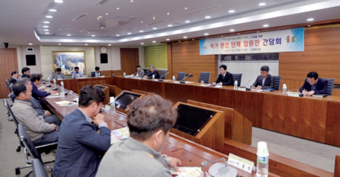 포천지역건축사회는 10월 17일 시정회의실에서 허가민원서비스 변화를 위해 개최된 ’허가 관련 단체 임직원 간담회‘에 참석했다고 밝혔다. 간담회는 포천시와 포천지역건축사회, 공간정보산업협회 임직원이 참석했으며 허가행정 발전방향에 대한 심도있는 이야기를 나누면서 마무리됐다.
