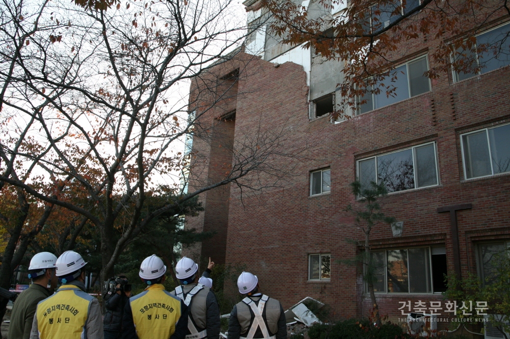 대한건축사협회(이하 사협)는 11월 16일 포항시 지진 피해현장 조사단을 긴급 파견했다. 사협 부회장 고봉규 단장은 “현장을 방문한 결과 부실시공이 가장 큰 문제인 것으로 보인다. 포항시는 대체로 지진에 취약한 연약지반이며, 필로티 기둥이 훼손된 건축물은 계단실이 편심으로 위치하여 지진으로 인한 파손이 더욱 커진 것으로 보인다”며 “비구조재 설계기준 개선뿐 아니라 감리자가 체크리스트를 통해 비구조재 시공포인트를 확인토록 개선이 필요하며, 기존 건축물 내진보강 지원 강화 방안도 서둘러야 한다”고 전했다. 지진대처와 관련한 제도개선 방안에 대해서도 “설계, 시공, 감리, 유지관리 등 건축 각 단계에서 지진에 대비한 관계 기준 미비사항과 관계전문기술자와 협력하는 부분에 대한 시스템적 문제 또한 종합적으로 검토할 계획이다”고 전했다.