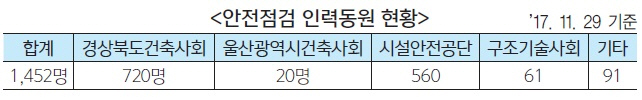 이재효 경북건축사회 회장은 “지진이 난 다음날인 16일부터 현재까지 총 800여 명의 경북·울산건축사회 회원들이 지진피해조사 등 복구활동에 나섰다. 현재 피해조사에 집중하고 중인데 차후 안전점검까지 수행할 예정이다”고 밝혔다. 경상북도건축사회·울산광역시건축사회 점검단은 지진피해 봉사에 나선 총 18개의 지원단체 중 가장 큰 규모다.