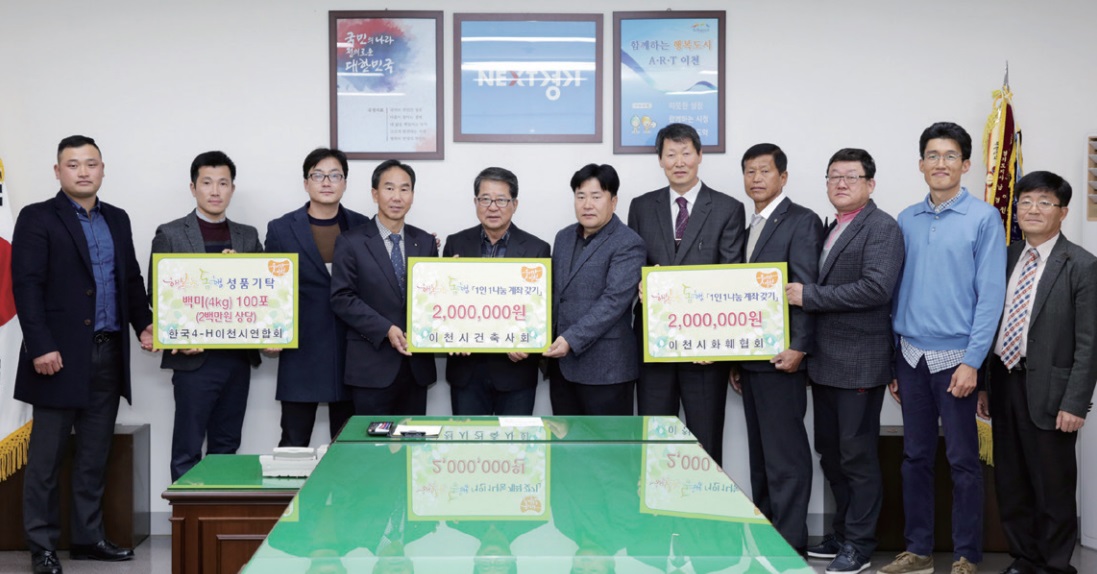 이천지역건축사회는 11월 21일 이천시청을 찾아 겨울을 맞아 이천의 어려운 이웃들을 위한 성금으로 200 만원을 기탁하며 ‘행복한 동행’ 사업에 동참했다고 밝혔다. 조병돈 이천시장은 “주위의 따뜻한 관심은 경제적으로 많은 도움이 될 뿐만 아니라 심적으로도 큰 힘이 된다”며 감사의 뜻을 전했다.