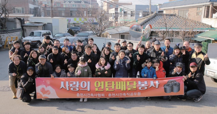 춘천지역건축사회는 12월 2일 회원 및 가족 약 30명과 춘천시청 건축과 직원 20명이 참석해 어려운 이웃들이 겨울을 따뜻하게 나기위한 성금 200만원을 전달하고 춘천시 효자2동 5가구에 1,500장 연탄나르기 봉사활동을 했다고 전했다.