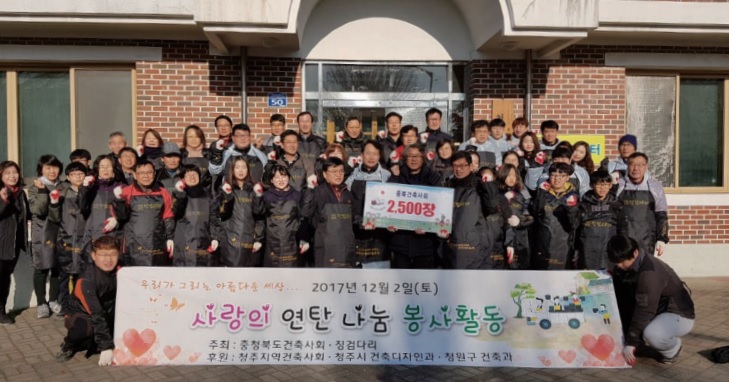 충청북도건축사회는 12월 2일건축사회 회원을 비롯하여 청주시청 건축디자인과, 청원구청 건축과 직원 등 50여 명이 함께 참석해 연탄 2,500장을 구입하여 청원구 2가구, 서원구 3가구 등 저소득층 5가구 등에게 전달했다고 밝혔다.