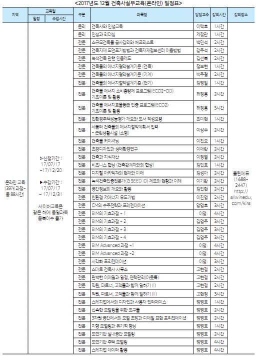 12월 건축사실무교육 일정이 공고됐으며 수강신청은 해당 과목 교육일 2~3주 전부터 가능하다.