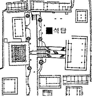다음은 진입방식에 따라 석탑의 위치가 달라진다는 것이다.<사진4> 석탑은 사찰의 주 건물인 금당(대웅전 등), 뒷산(진산)과 함께 주요한 3대 시선목표(시각점)로서, 이것을 앙시하는(우러러보는)데 있어 똑바로 놓을 것인가 아니면 비뚤어 놓을 것인가? 만약 비뚤어 둔다면 중앙에 무엇을 둘 것인가? 하는 문제는 복잡하다. 탑은 뾰쪽하므로 木형에 해당하고 금당은 대게 용마루가 웅장하므로 토형에 해당한다. 그렇다면 진산은 무슨 형이면 상생하고 이것을 어떤 시각 상에 놓아야 할까? 이것이 일직선이면 공간이 정적이 될 것이고 비뚤어져 있으면 동적이긴 하지만 공간에 균형을 잡기가 쉽지 않을 것이다.