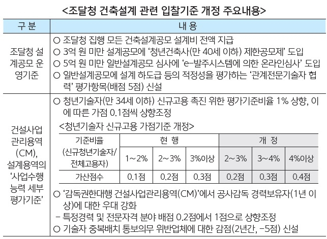이번 개정은 설계비 감액지급 관행 폐지와 함께 설계공모 청년건축사 수주 확대를 유도하고, 청년기술자 고용우수기업 지원을 확대키 위한 조치라는 게 조달청의 설명이다.