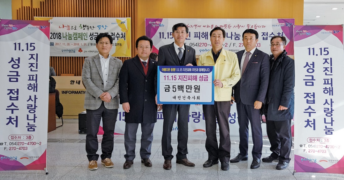 대전광역시건축사회는 2017년 12월 11일 포항시청을 방문하여 포항지진 피해 이재민을 위해 써달라며 대전건축사회 회원 65명이 모은 성금 및 협회 성금 500만원을 전달했다. 성금은 지진피해로 고통을 겪고 있는 포항 지역민들을 위해 쓰일 예정이다.