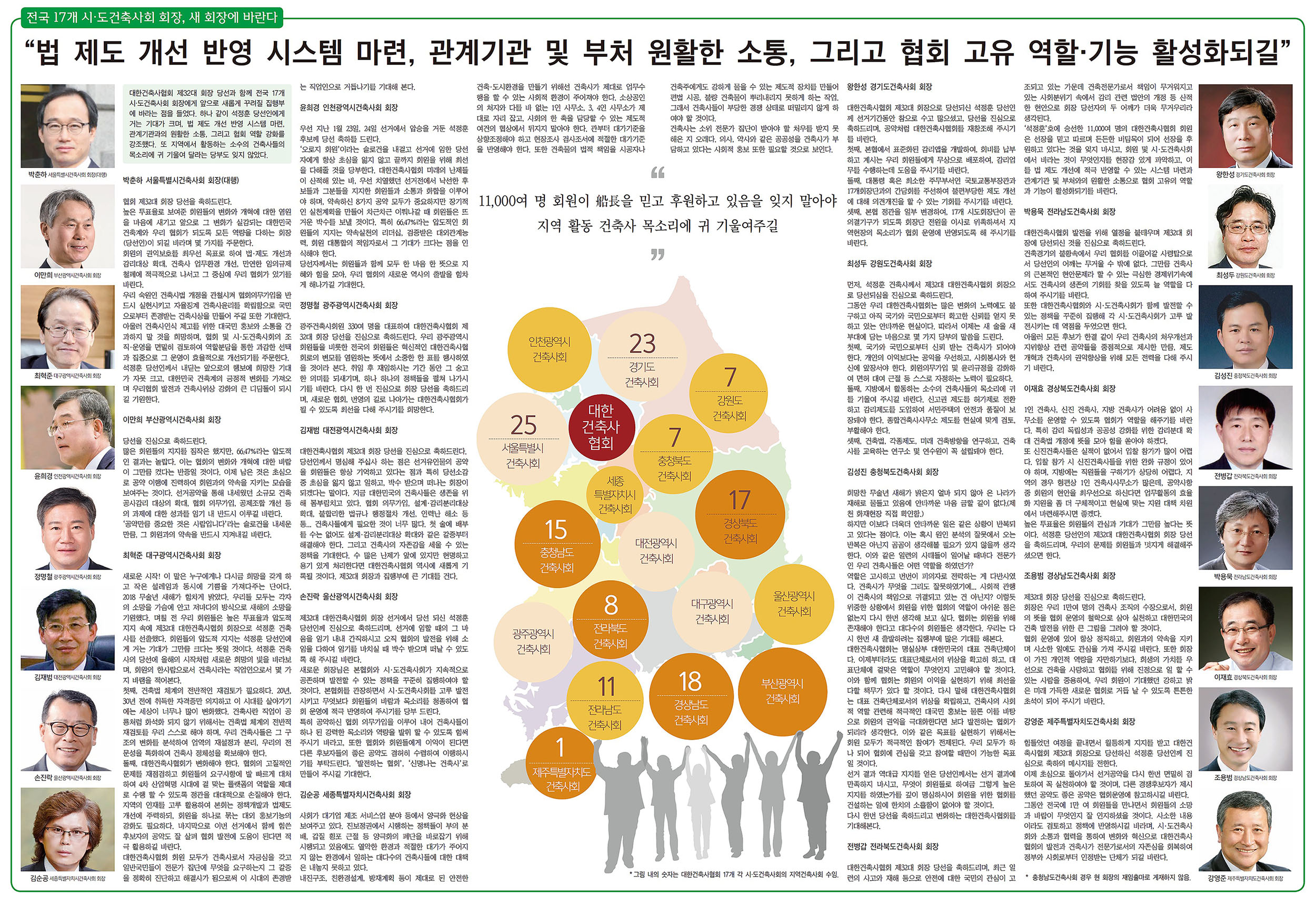 대한건축사협회 제32대 회장 당선과 함께 전국 17개 시·도건축사회 회장에게 앞으로 새롭게 꾸려질 집행부에 바라는 점을 들었다. 하나 같이 석정훈 당선인에게 거는 기대가 크며, 법 제도 개선 반영 시스템 마련, 관계기관과의 원활한 소통, 그리고 협회 역할 강화를 강조했다. 또 지역에서 활동하는 소수의 건축사들의 목소리에 귀 기울여 달라는 당부도 잊지 않았다.