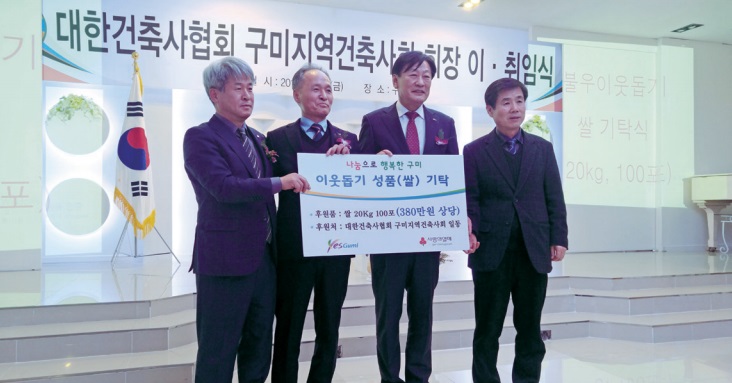 구미지역건축사회는 1월 26일 구미웨딩에서 열린 구미지역건축사회 총회에서 회장 이·취임식과 더불어 이웃돕기 쌀 2,000㎏을 전달했다. 이 날 모인 쌀은 이·취임식을 축하하는 화환대신 마련된 것으로 설을 맞아 어려운 소외계층에게 전달될 예정이다.