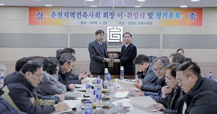 춘천지역건축사회는 1월 25일 강원도 건축사회관 회의실에서 정기총회를 열고 석근호(창원 건축사사무소) 전 회장 이임식과 이강섭(강인 건축사사무소) 신임 회장의 취임식을 가졌다.