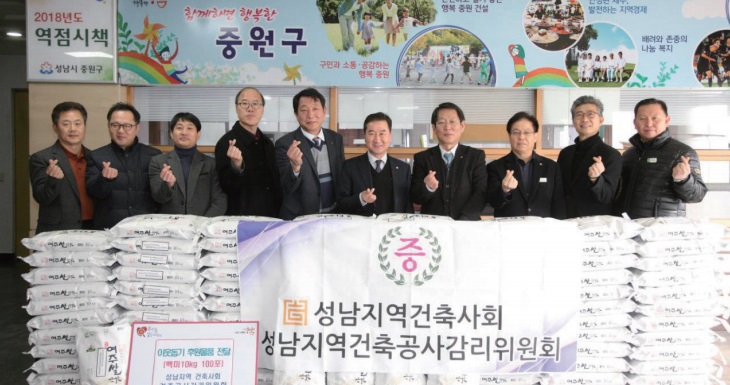 성남지역건축사회는 1월 25일 성남시 중원구청을 방문해 어려운 이웃이 따뜻한 설날을 보낼 수 있도록 백미 100포를 전달했다고 밝혔다. 기탁된 백미는 따뜻한 이웃사랑이 전달되도록 저소득 가구를 선정하여 배분될 예정이다.