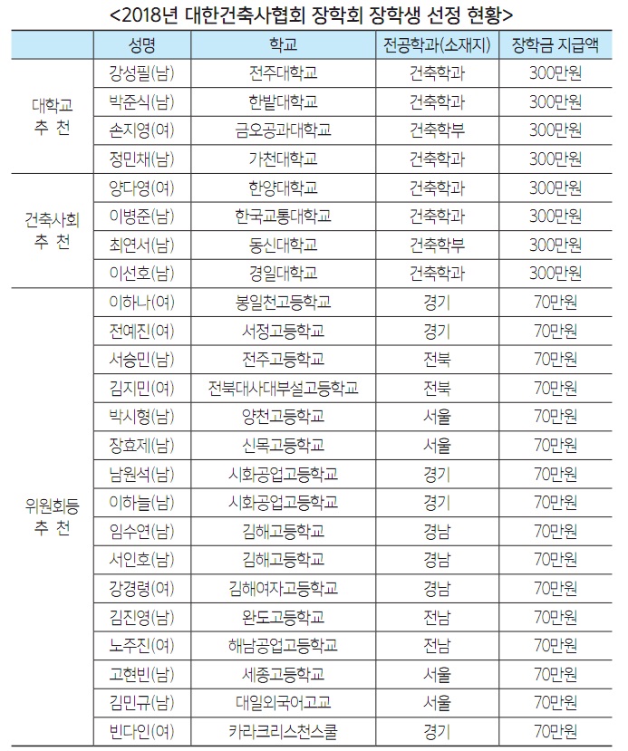 2018년 대한건축사협회 장학회 장학생 24명(대학생 8명, 고등학생 16명)이 선정됐다. 건축문화대상 계획부문 출품 관련 대학, 시·도건축사회 추천에 따라 선정됐으며, 대학생에게는 각 300만원, 고등학생에게는 각 70만원이 전달된다. 2월 22일 제52회 정기총회에서 장학금이 전달될 예정이다.