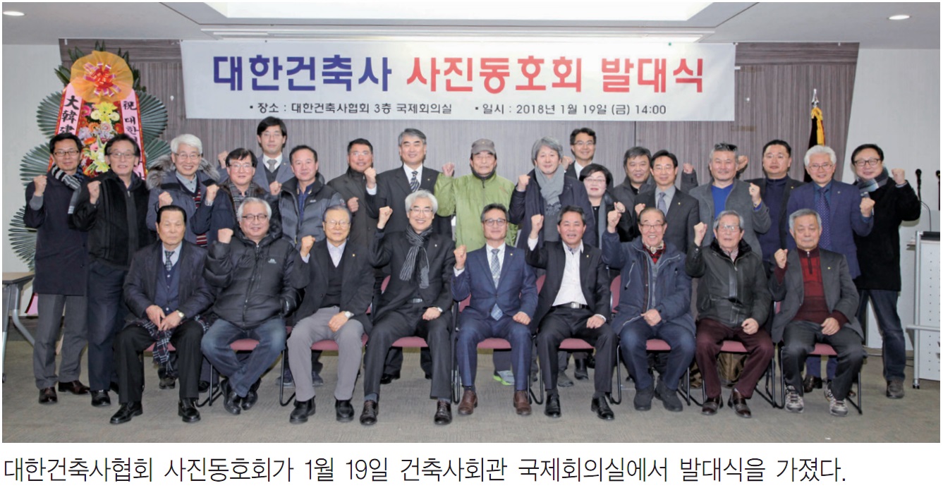 대한건축사협회(이하 사협) 사진동호회가 1월 19일 건축사회관 국제회의실에서 발대식을 가졌다. 이날 서울특별시건축사회 건축답사 및 사진동호회와 경상남도건축사회 사진동호회, 대구광역시건축사회 사진작가회, 인천광역시건축사회 사진동호회 등이 참여했다.