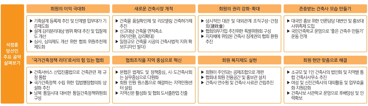 대한건축사협회(이하 사협) 32대 회장선거 과정에서 석정훈 당선인이 가장 강조한 정책의 우선순위는 회원의 생존에 대한 사항이다. <서울, 강원권역> 후보자 토론회 기조연설에서도 “우리가 하는 업무에 대한 정당한 평가와 합당한 대가를 받는 기반을 마련하는 것. 그리고 이러한 안정적인 삶의 바탕에서 건축사로서의 사회적 역할과 책임을 다하는 것. 이것이 협회 운영의 목표이고 정책의 방향이다”고 강조한 바 있다. 회원생존권 분야 공약으로는 크게 ▶ 회원의 이익 극대화 ▶ 새로운 건축시장 개척 ▶ 회원 권리 강화·확대로 요약된다.